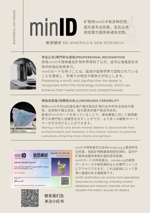 In view of the possibility of international circulation or international auction of the samples submitted by the specific client, minID & M D Mineral & Gem Researchis specially entrusted to issue a test report in English. This report is only an academic suggestion based on the current scientific research results of the laboratory. The CMA logo is not used in the territory of the People's Republic of China. It is for internal use by the specific client and does not serve as a legally valid certification or legality document.